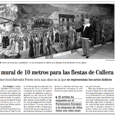 Una vez más Salvador Ferrer es noticia en los periódicos y en cadenas televisivas de la Comunidad Valenciana. Esta vez, lo que llamó la atención de los medios de comunicaciones, como "Levante-La Ribera" en su edición de 14.01.2009, fue su nueva obra de 10,5 m de longitud por 2,5 m de altura, dedicada a las fiestas patronales de su ciudad natal "Cullera". Según el pintor, dicho cuadro de dimensiones espectaculares, aparte de ser un homenaje a todos los ciudadanos cullerenses, quiere ser "un reto" dirigido al ayuntamiento de Cullera. Según Salvador Ferrer, "su ciudad" conocida por sus actividades culturales, sobre todo en su faceta musical, no tiene sin embargo un lugar en condiciones para poder albergar una buena exposición de arte, capaz de atraer a diversos artistas célebres, tanto de la ciudad, como de otros lugares de España y del mundo. El cuadro representa diferentes actos de las fiestas patronales, reflejadas en un estilo más realista de lo que es normalmente su estilo, que suele ser mas expresionista, para poder llegar a la gente a quien se la dedica.